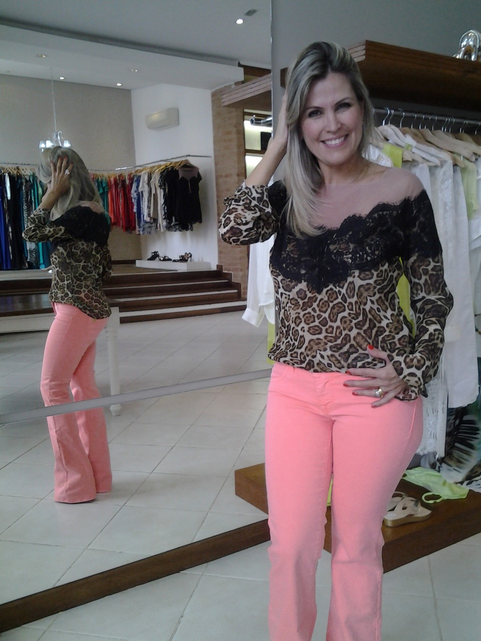 As produções foram diversificadas, para agradar a todos os estilos: um conjunto lindo com saia couro fake e blusa rendada com detalhes em couro super trend!! Calça flair animal print de inverno a verão!! E para fechar shorts - amo shorts - montei um look short + camisa seda+ botinha - look super casual!! E.. shorts bordado com detalhes em couro e uma camisa deusa transparente - chiquérrima!!